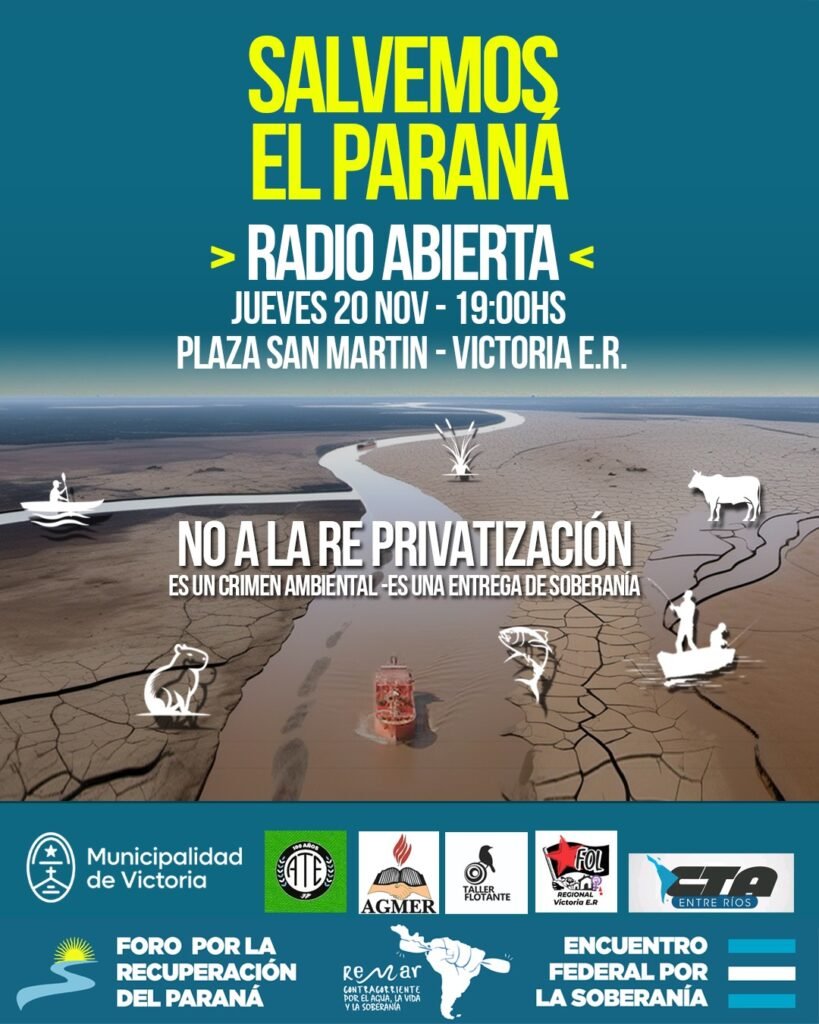 El Foro por la Recuperación del Paraná realizará este miércoles una radio abierta en la Plaza San Martín de Victoria, Entre Ríos, a las 19. Allí convocan a la ciudadanía a informarse y involucrarse en la defensa del río.