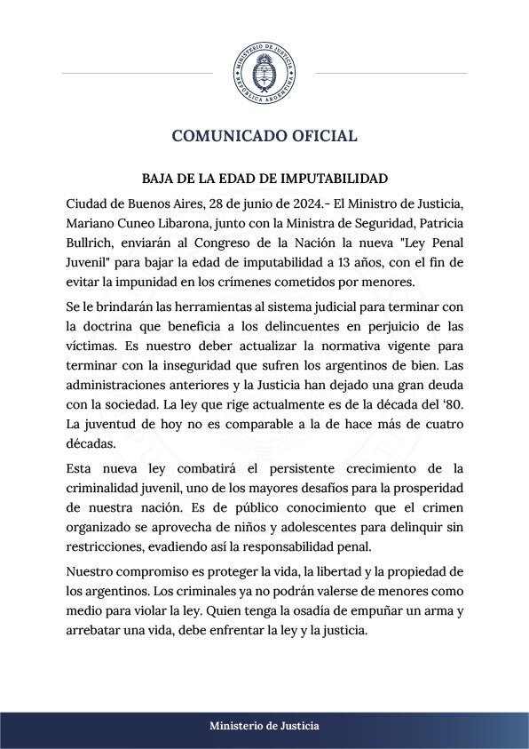 En tanto, el Ministerio de Justicia lanzó un comunicado oficial por redes sociales, justificando que el proyecto de Ley Penal Juvenil “le brindarán las herramientas al sistema judicial para terminar con la doctrina que beneficia a los delincuentes en perjuicio de las víctimas” y apunta a los niños y adolescentes que son utilizados por las bandas narcos como soldaditos: “Es de público conocimiento que el crimen organizado se aprovecha de niños y adolescentes para delinquir sin restricciones, evadiendo así la responsabilidad penal. Nuestro compromiso es proteger la vida, la libertad y la propiedad delos argentinos. Los criminales ya no podrán valerse de menores como medio para violar la ley. Quien tenga la osadía de empuñar un arma y arrebatar una vida, debe enfrentar la ley y la justicia“.