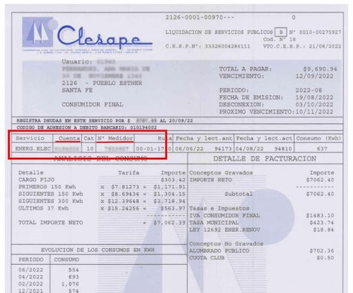 La Municipalidad de Pueblo Esther aplica en las facturas de energía eléctrica cargos adicionales por el alumbrado público y el uso del espacio aéreo, lo que incrementa el costo mensual de los usuarios en aproximadamente 9.900 pesos por encima de la tarifa básica.