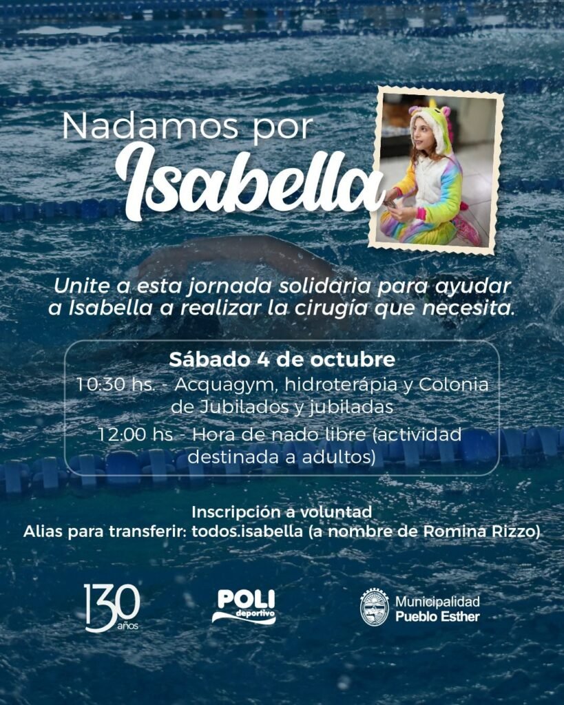 El próximo sábado 4 de octubre, el Polideportivo Municipal de Pueblo Esther será escenario de una nueva muestra de solidaridad comunitaria. Bajo la consigna de “Nadamos por Isabella”, se desarrollará una jornada recreativa que incluirá actividades de aquagym, hidroterapia y natación libre, con el objetivo de recaudar fondos para costear la operación de cadera de la joven Isabella, alumna de la Colonia de Vacaciones del Poli.