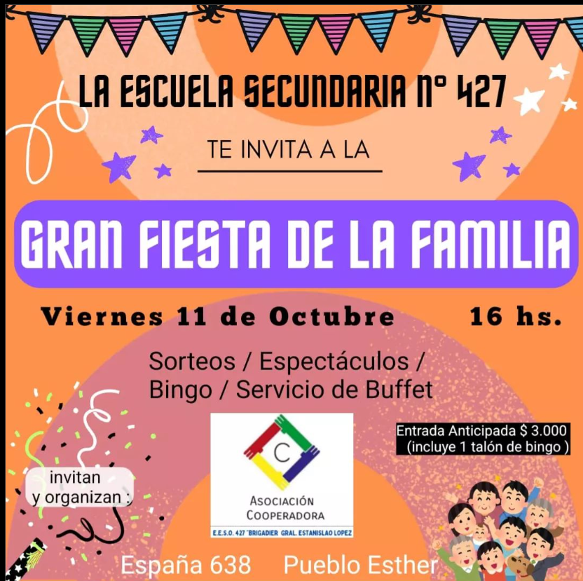 La Escuela Secundaria N° 427 de Pueblo Esther invita a toda la comunidad a participar de su Gran Fiesta de la Familia este viernes 11 de octubre a partir de las 16 hs. El evento contará con una variada oferta de entretenimiento, incluyendo un bingo mayor con un premio de $60.000, además de espectáculos en vivo, sorteos y un servicio de buffet.