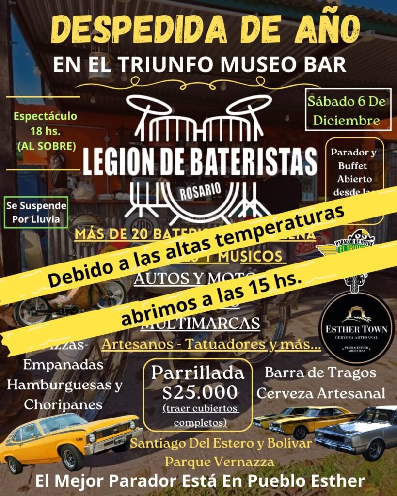 Este sábado 6 de diciembre, Pueblo Esther vivirá un hecho inédito: la llegada de La Legión de Bateristas, un proyecto histórico del rock rosarino que por primera vez sale de la ciudad para presentarse en la localidad. El show será en El Triunfo Museo Bar, en el marco de su despedida de año, con más de veinte bateristas en escena, músicos invitados y una jornada cargada de rock.