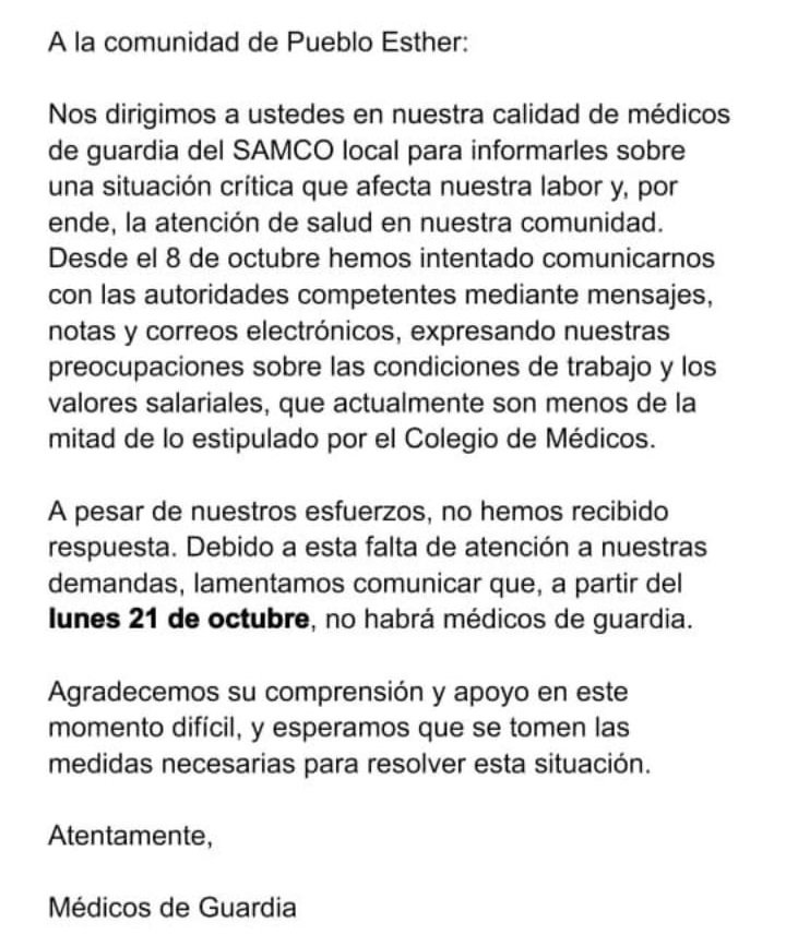 El personal médico de guardia del SAMCo de Pueblo Esther ha anunciado que, a partir del lunes 21 de octubre, dejarán de prestar servicios en las guardias debido a la falta de respuestas de las autoridades competentes. A través de un comunicado dirigido a la comunidad, los profesionales han expresado su malestar ante las condiciones laborales y salariales actuales, que aseguran están por debajo del mínimo estipulado por el Colegio de Médicos.